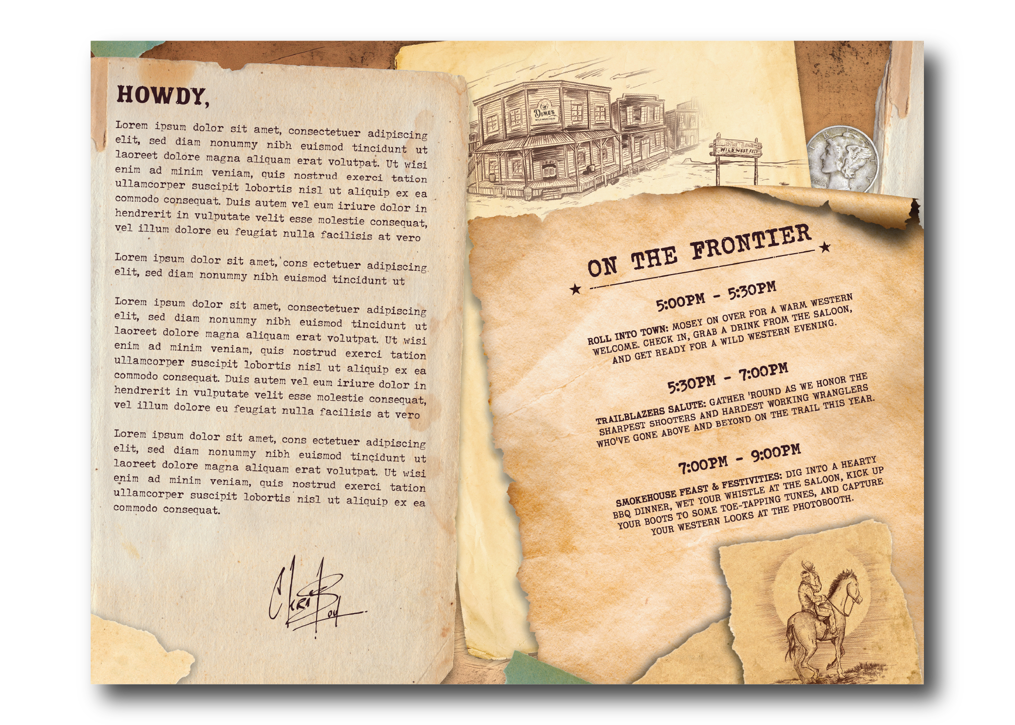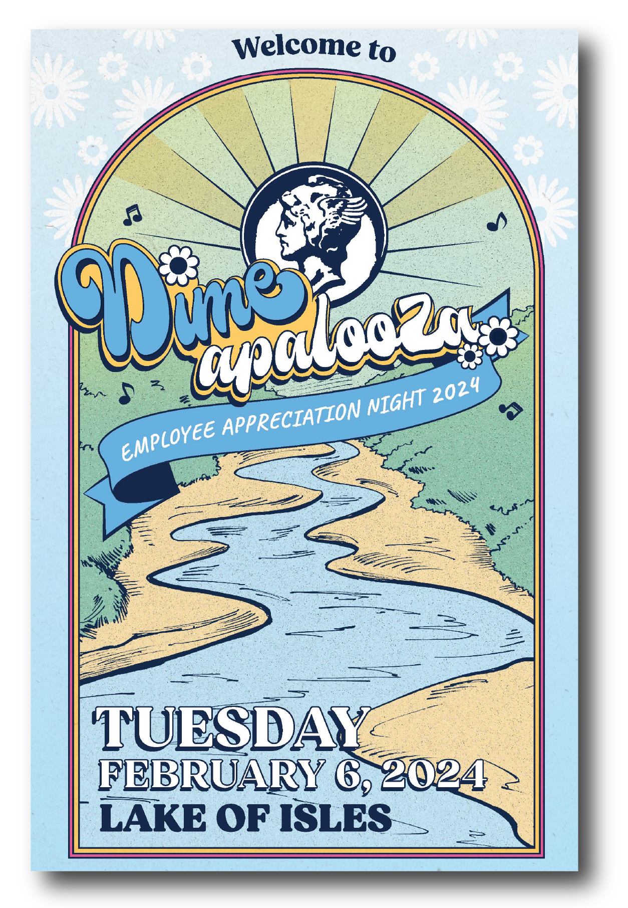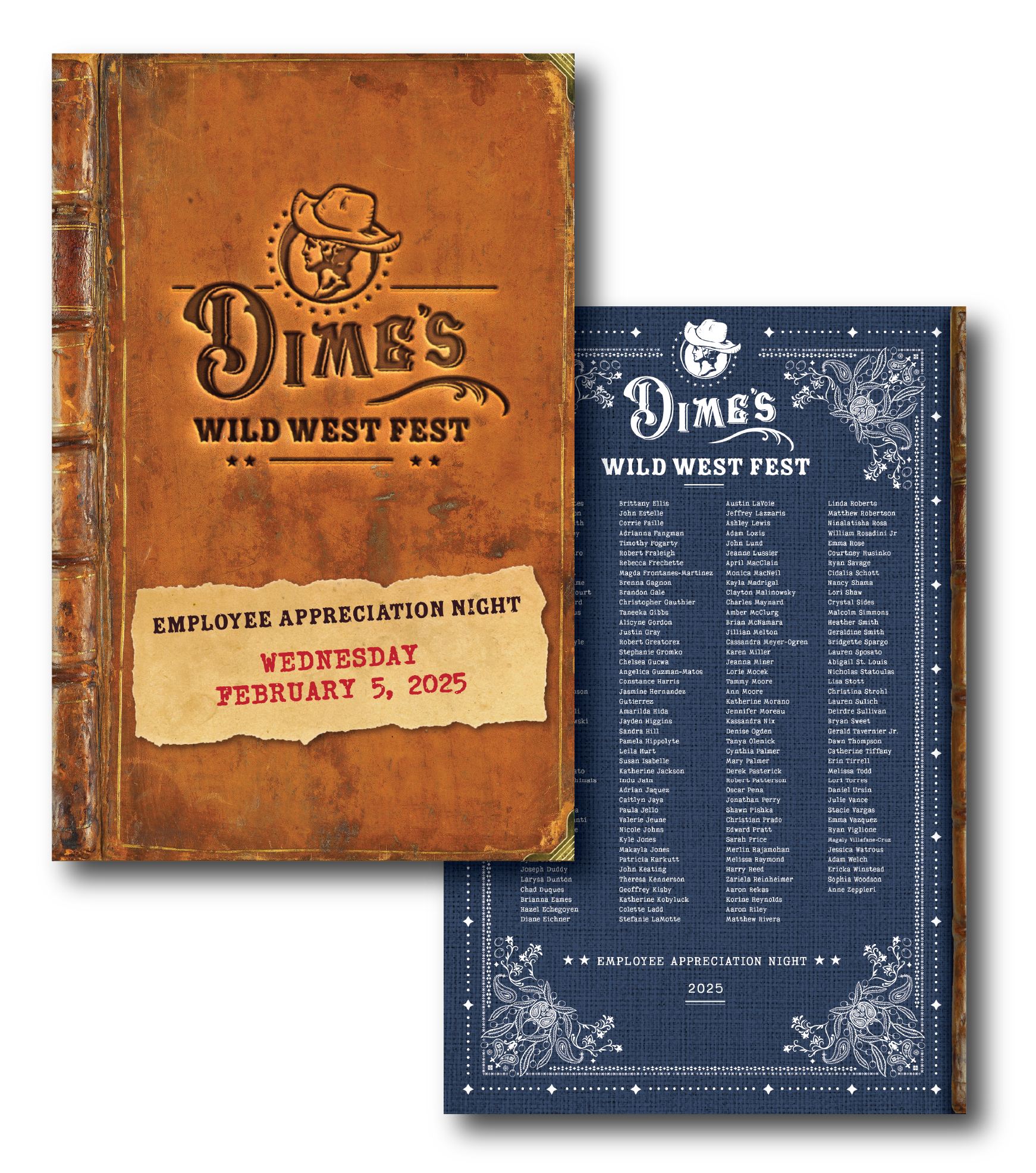 The Dime Bank Employee Appreciation Night is an annual event honoring the dedicated and hardworking employees of the organization. Each year the event utilizes a different theme, ranging from the styles of music festivals to the drama of the wild west, and event programs, signage, and apparel is designed to fit the imagery of the event as a whole.